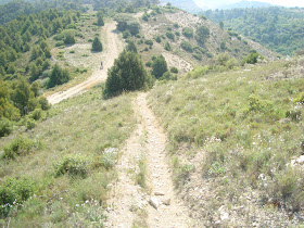 Vamos bordeando la sierra por pistas entre pinos y campos de labor dejando y alguna caseta, yendo hacia la Sierra Alta y Bay Serran, llegamos a un cruce que seguimos a la izquierda.