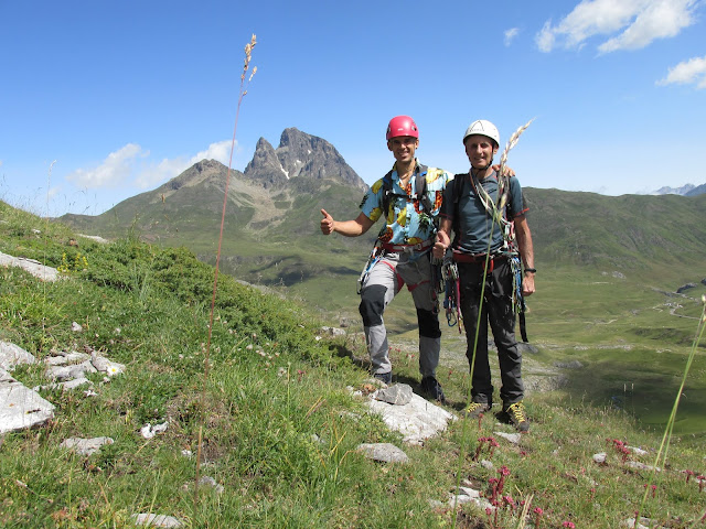L3: Largo casi todo en diagonal. Empieza con IV+, luego vienen unos pasos de 6a/A0 no obligados, y acaba en IVº. Desde esta reunión, nos podemos escapar andando por unos prados empinados a la derecha (40 metros).