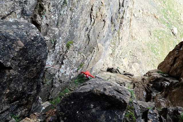 una travesía a izquierdas con un paso un poco raro (IV+/V) para llegar a