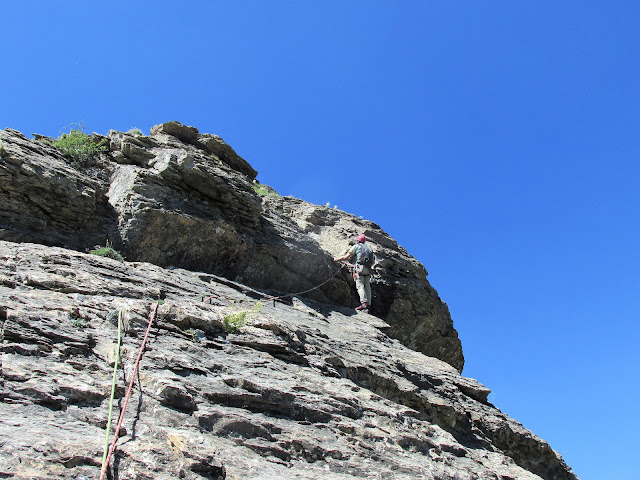 Largo 5 (35 metros–6a) Escalar un muro con repisas herbosas, el paso de 6a está en un pequeño desplome antes de la reunión en un árbol.